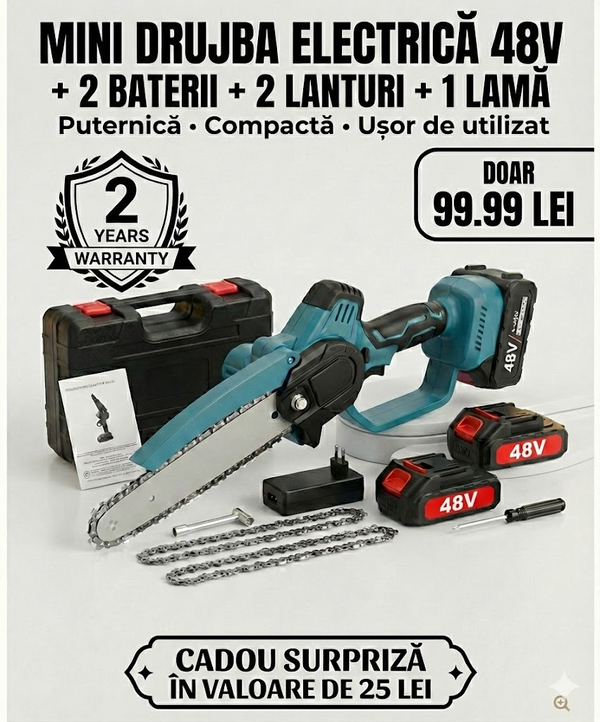 PROMO: Mini Fierastrau Electric Cu 2x Acumulatori 48V,, 2 x lant, 1 x Lama 6 Inch