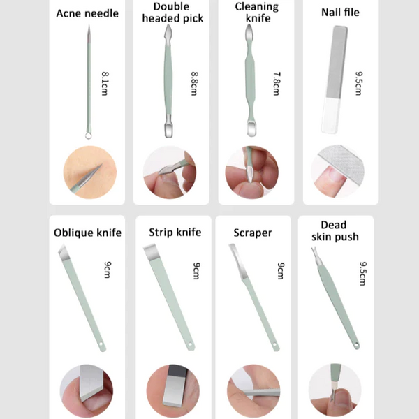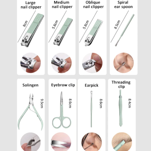 Trusa include toate instrumentele necesare pentru o manichiură și pedichiură completă, toate din oțel inoxidabil de înaltă calitate.