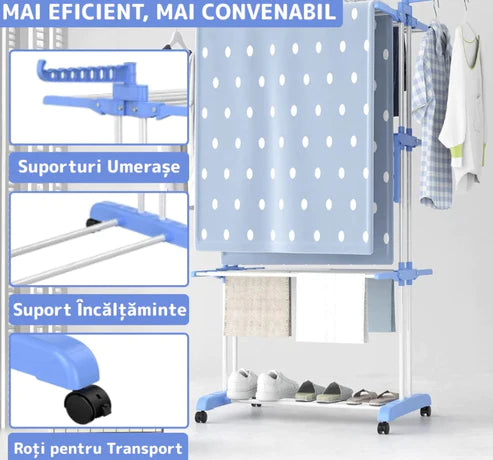 Mobil și Pliabil: Una dintre cele mai mari avantaje ale acestui uscător este portabilitatea sa. Poți să-l deplasezi cu ușurință în jurul casei sau să-l pliezi atunci când nu este în uz, ceea ce îl face potrivit pentru apartamente mici sau camere cu spațiu limitat.