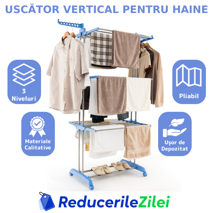 Un uscător vertical pentru rufe și haine, special creat pentru spații mici, este unul dintre cei mai buni aliați pentru menținerea ordinii și prospețimii în garderoba ta. Cu un design ingenios și o funcționalitate pe măsură, acest uscător reprezintă soluția perfectă pentru uscarea și depozitarea hainelor într-un mod eficient și practic.